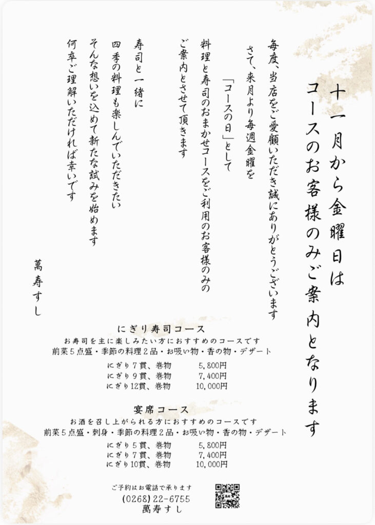 11月より、ゆっくりと料理と寿司を召し上がっていただくため、新たに「コースの日」を設けたいと思います。つきましては、毎週金曜はコース料理を事前にご予約いただいたお客様のみのご案内となります。ご不便をおかけしますが、何卒ご理解、ご協力の程お願い申し上げます。